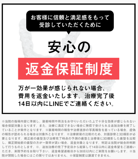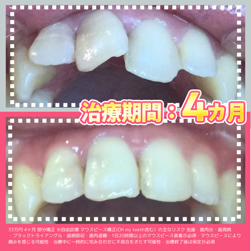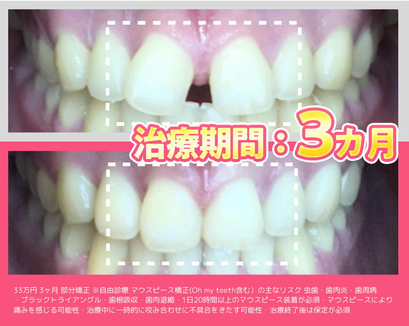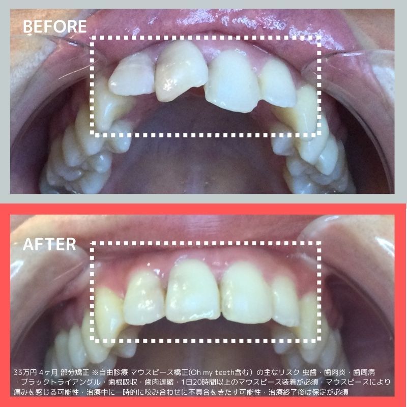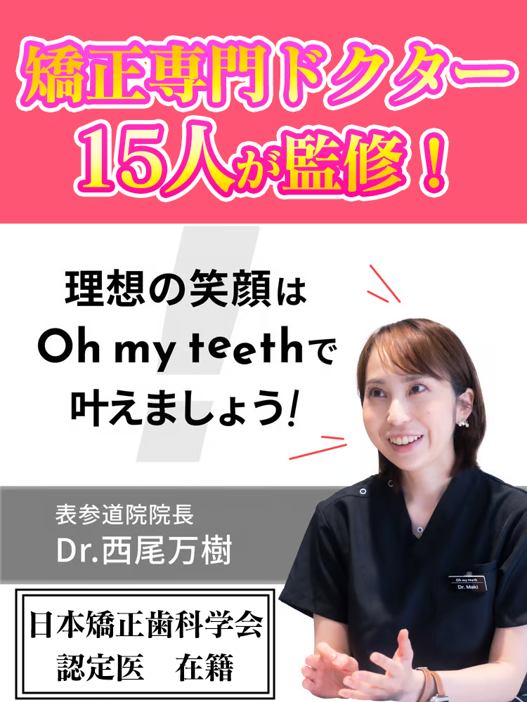 ※マウスピース橋正(Oh my teeth含む)の主なリスク:虫歯・歯周病・ブラックトライアングル・歯根吸収・歯肉退縮・1日20時間以上のマウスピース装着が必須・マウスピースにより痛みを感じる可能性・治療中に一時的にかみ合わせに不具合をきたす可能性・リテーナーを最低1年間は1日20時間以上装着、その後徐々に着用時間を減らし、2年目以降は夜間のみの着用推奨。