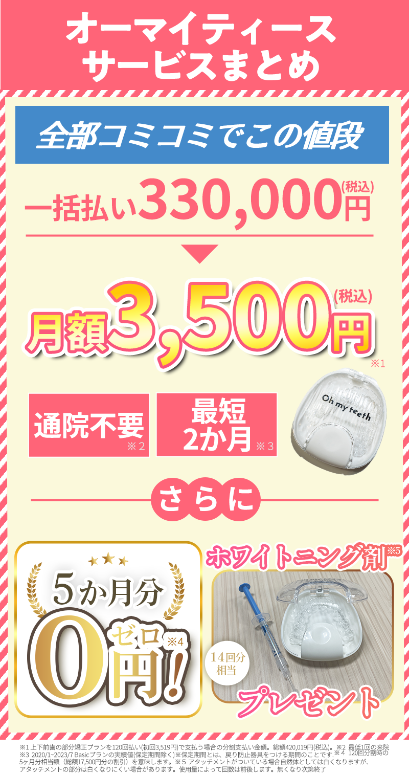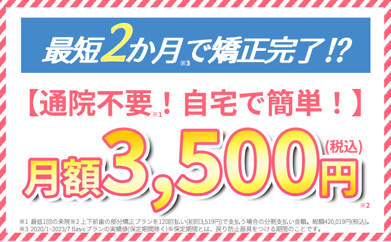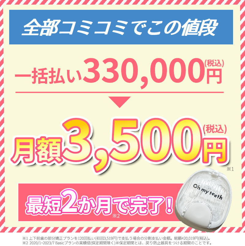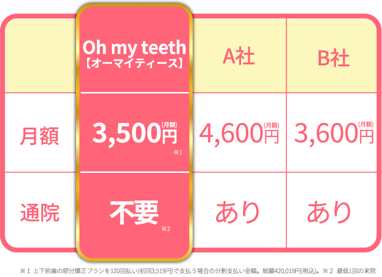 ※ 上下前歯の部分矯正プランを120回払い(初回3,519円)で支払う場合の分割支払い金額。総額420,019円(税込)。